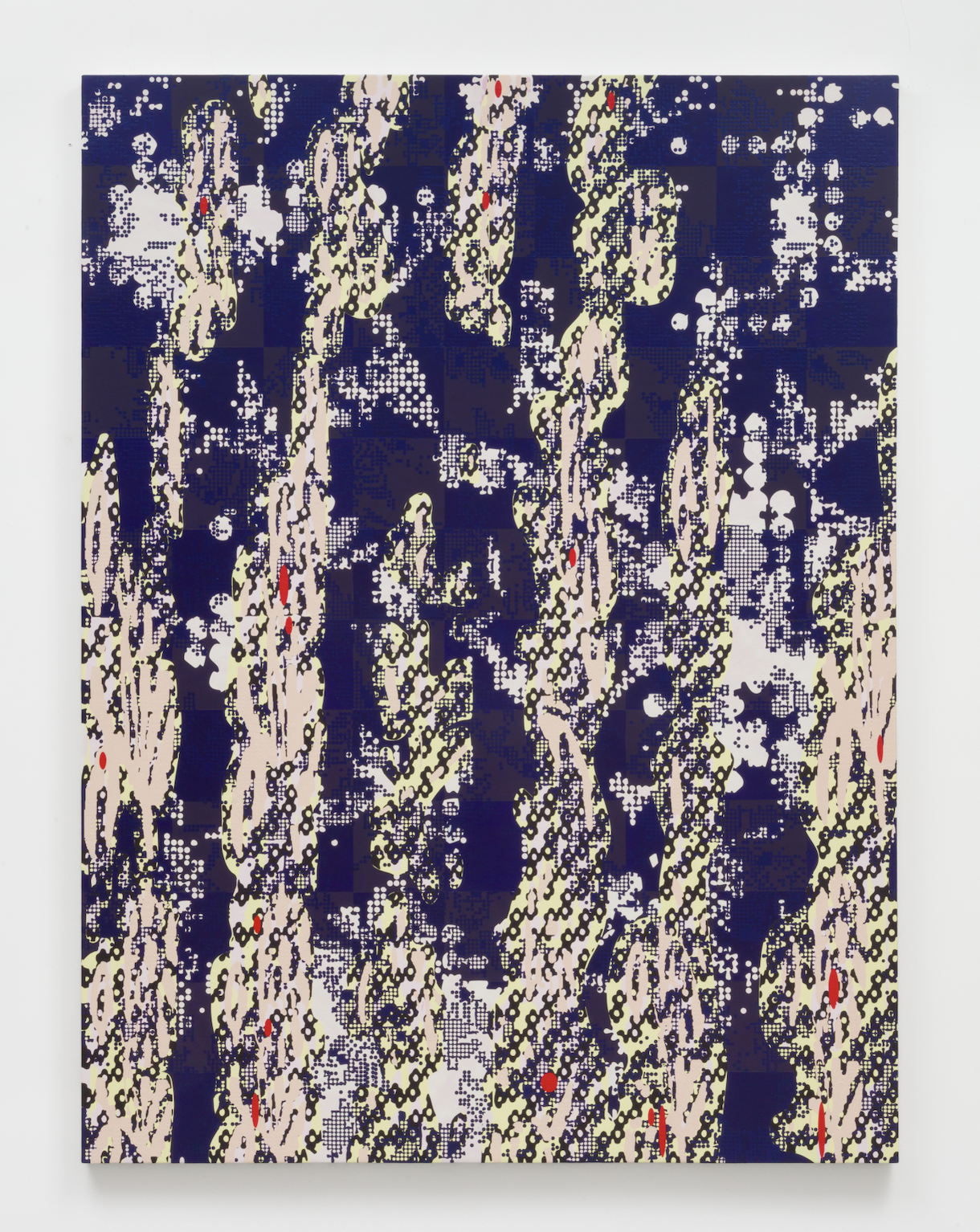 In All Systems Fail, Alex Heilbron presents six large scale paintings born from the confluence of our physical and digital realities. Working from images found online, she enlarges and crops pictures of resonant things like leaves, faces, and flowers, obsessively burrowing into them at a pixelated level, using her intuition to find an underlying structure. She then meticulously rounds, adjusts, and modifies the borders of these forms, edge by edge, to produce a vector file that can be read by a vinyl cutter. Once she’s assembled a collective group of structures, she prints them and lays their vinyl embodiments over the canvas. She then pours and brushes paint over these digitally native stencils to build up a complex epidermal surface, before removing the vinyl like a used band-aid. The outcome is painstakingly handmade yet delimited by digital systems.