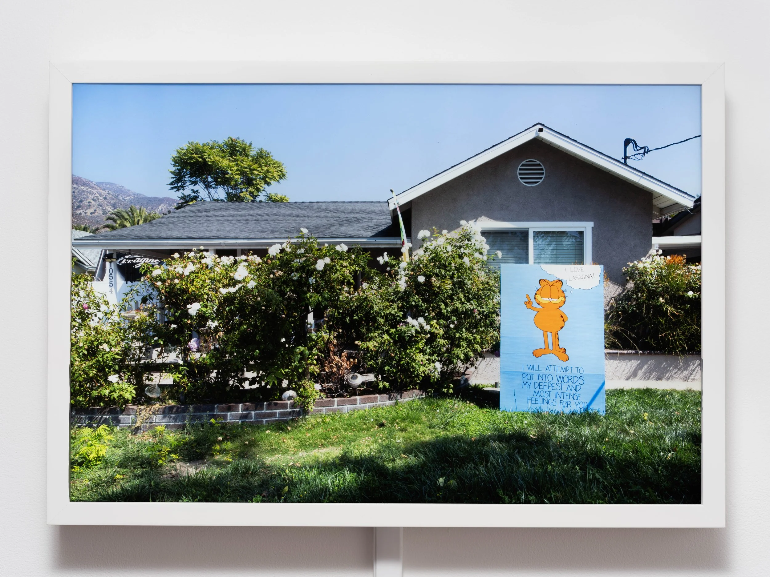 The use of text in the greeting cards further emphasizes my emotional attachment to the homes, while Garfield’s presence makes him a tour guide and an entry point into the photographs in being a well-beloved cat. Through these ephemeral gestures, Los Angeles Feelings becomes an expression of memory and emotion in a city that constantly changes, and makes it possible to trace a sign of my family’s existence in the images left behind.
